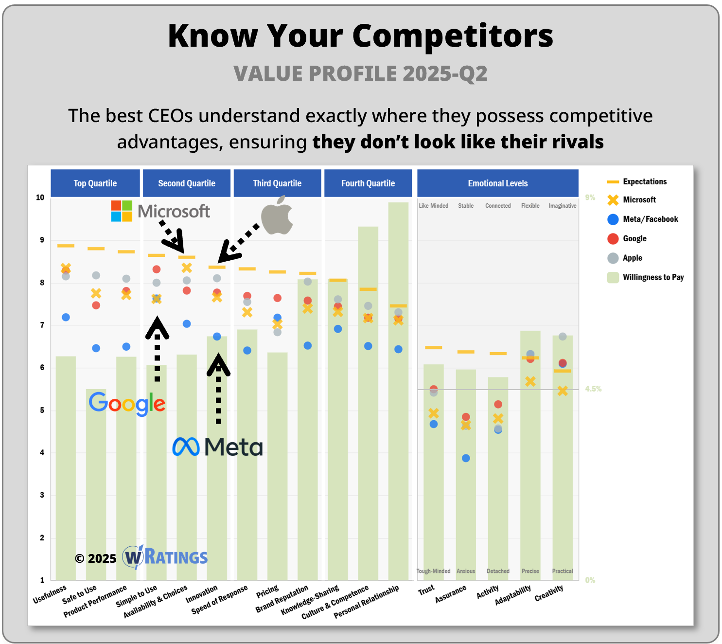 In our 2025-Q2 panel data, customers see Apple owning Innovation, Microsoft owning Availability/Choices, and Google owning Simple to Use. Clear differentiators amongst their peers. Digging into their financial results clearly shows their focus wins customers.