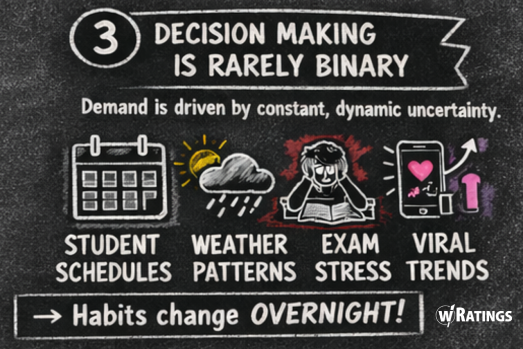 Dining decisions involve managing constant, dynamic uncertainty. Student schedules, weather patterns, exam stress, and viral social media trends change consumption habits seemingly overnight.