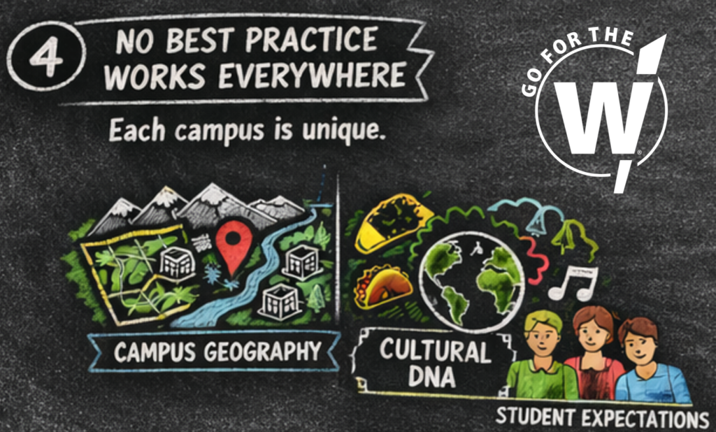 The physical geography, cultural DNA of a campus, and student expectations dictate the entire strategy. And every campus is unique as no “best practice” works everywhere.