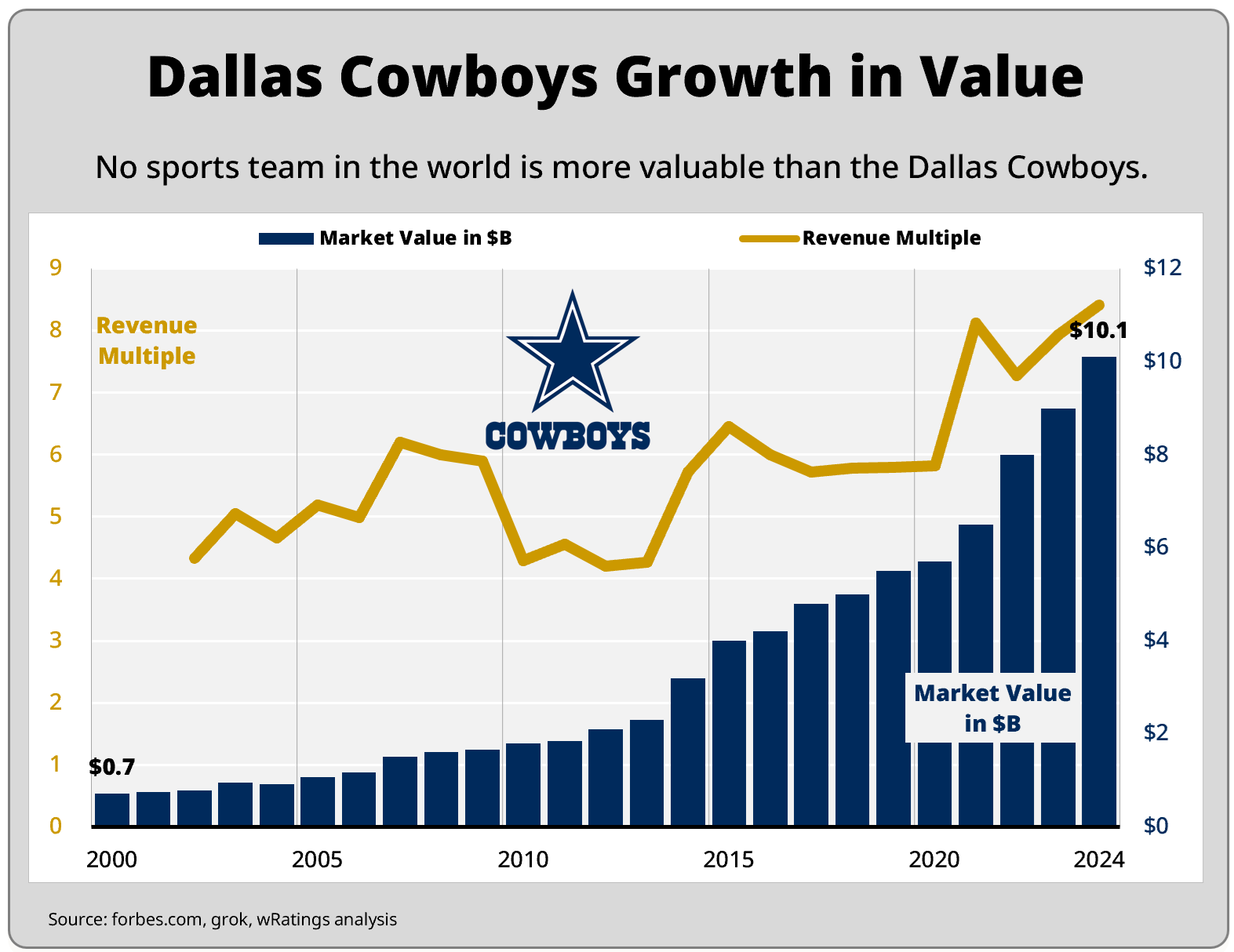 One team owner stands well above the rest today. In 1989, oilman Jerry Jones bought the Dallas Cowboys for $140M. And despite not winning a Super Bowl since 1996, the Cowboys have been the most valuable sports franchise in the world for nine consecutive years. Current valuation is $10.1B with a growing revenue multiple now at 8.4X.
