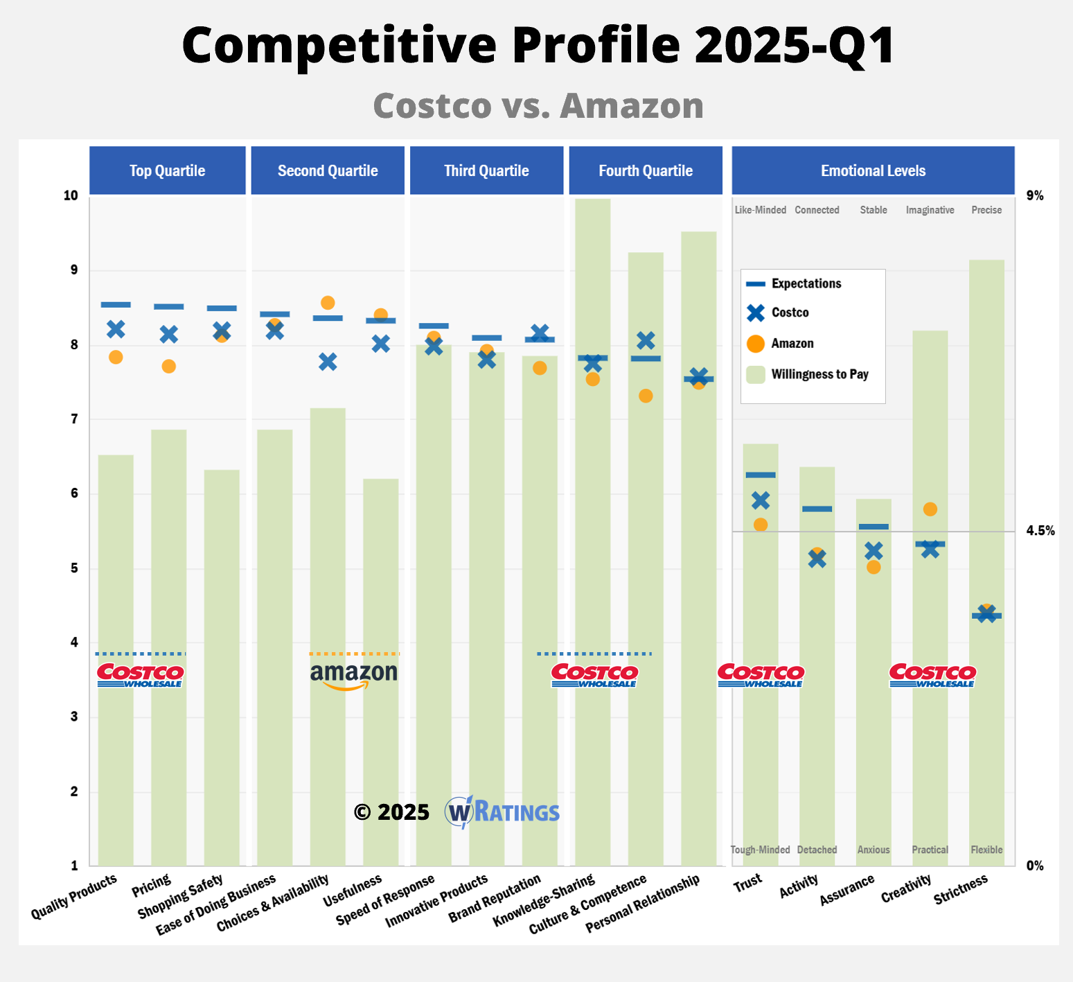 So how does Costco achieve this? By focusing on a few key customer strengths that others don’t or won’t. In their 2025-Q1 Competitive Profile, customers believe Costco is superior to Amazon in seven areas: Quality Products, Pricing, Brand Reputation, Knowledge-Sharing, Culture/Competence, Trust, and Creativity. Several areas where customers are willing to pay (WTP) the most, meaning that Costco has strong pricing power should they choose to exercise it.