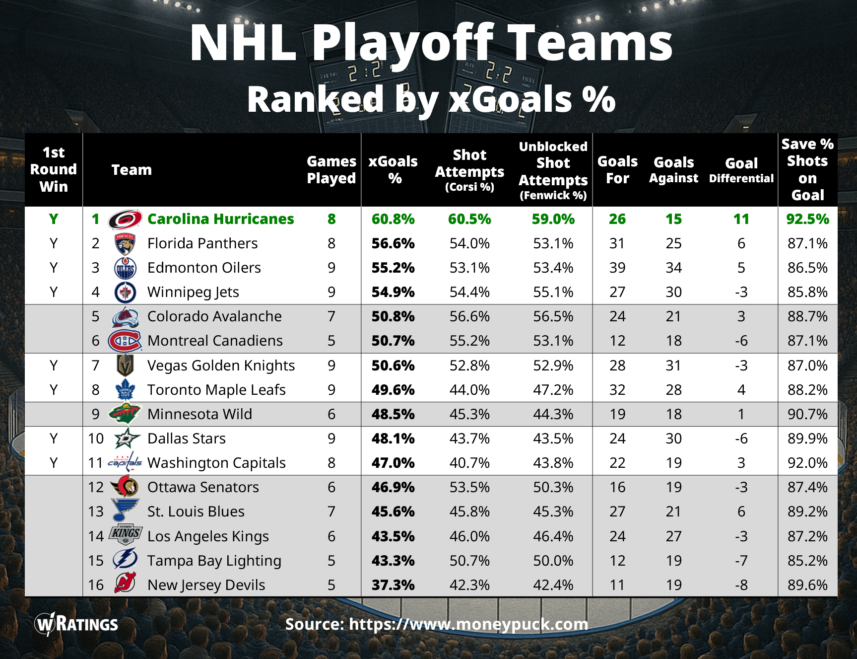 According to the Moneypuck.com website, Carolina is ranked #1 in xGoals % (using All Situations in the Playoffs through 5/11/2025). Rounding out the top 4 teams are Florida, Edmonton, and Winnipeg, who all won in the 1st Round to advance.