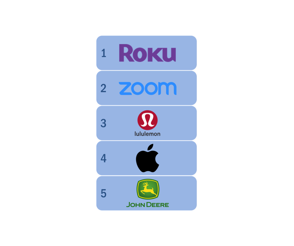 Discount companies (e.g. Costco, Southwest, Schwab) performed well with customers at the start of the pandemic but dipped quickly in 2022, and are rebounding to perform well today