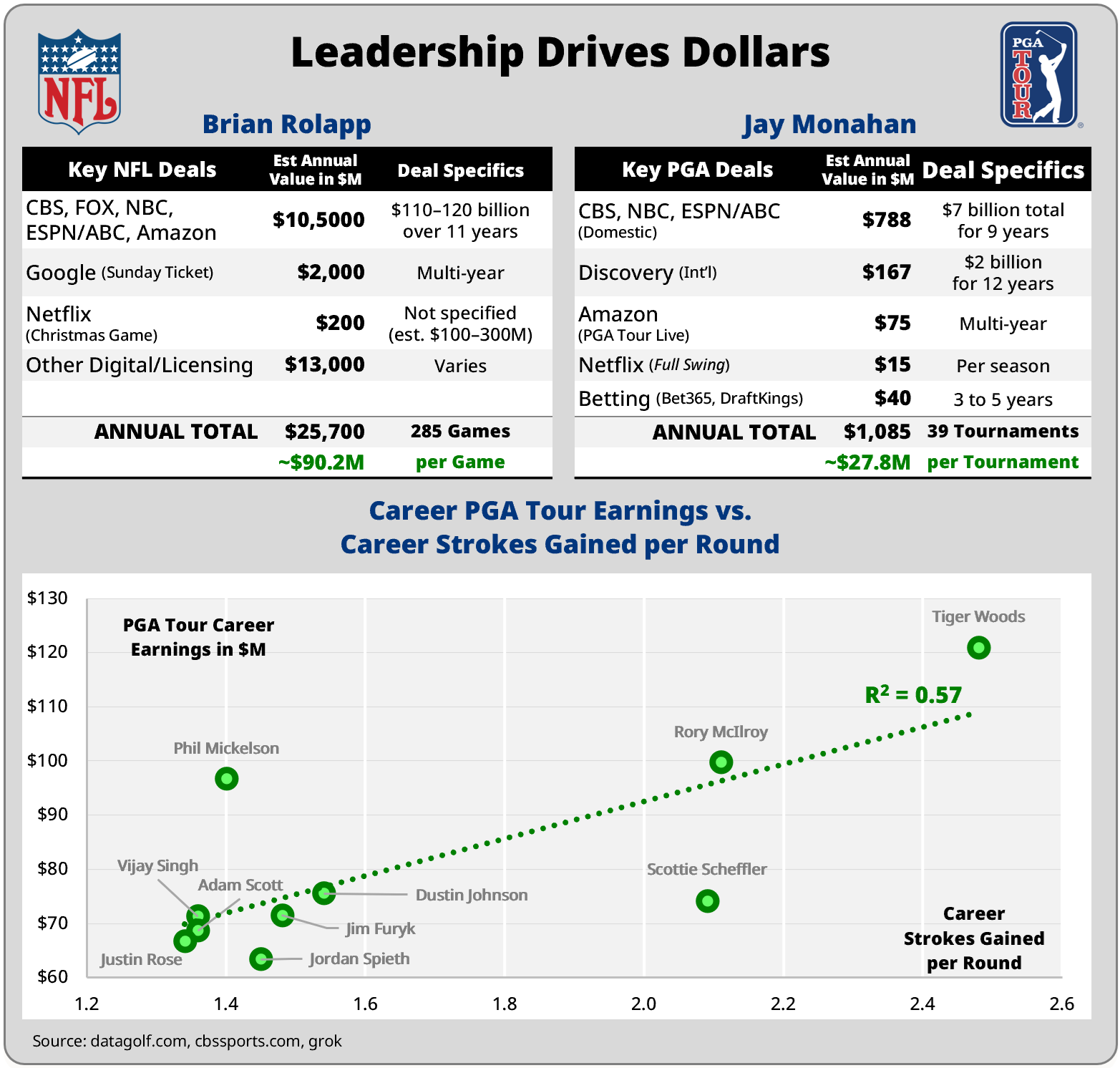 With the PGA Tour, Rolapp dealmaking will be much more difficult and much more complex. He will need to sway 100s of professional golfers individually and collectively to participate in any media deals. Over half ($13B) of the NFL deals Rolapp cut were for social media and content partnerships, and he has some innovation to work with at PGA. For example, the virtual TGL debuted this year, which seems like a natural fit to develop more media dollars. While no ownership stake, the PGA Tour is a partner with TGL.