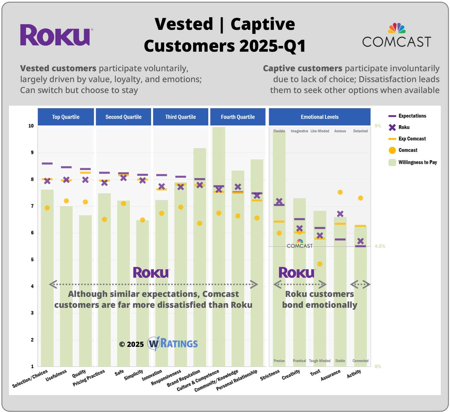 Even though Comcast customers have mostly similar expectations (but lower) as Roku customers, they are substantially less satisfied as of 2025-Q1 across all 12 functional needs. When it comes to building emotional bonds, Roku customers feel they have more flexibility, think more like them, and stay connected with them.