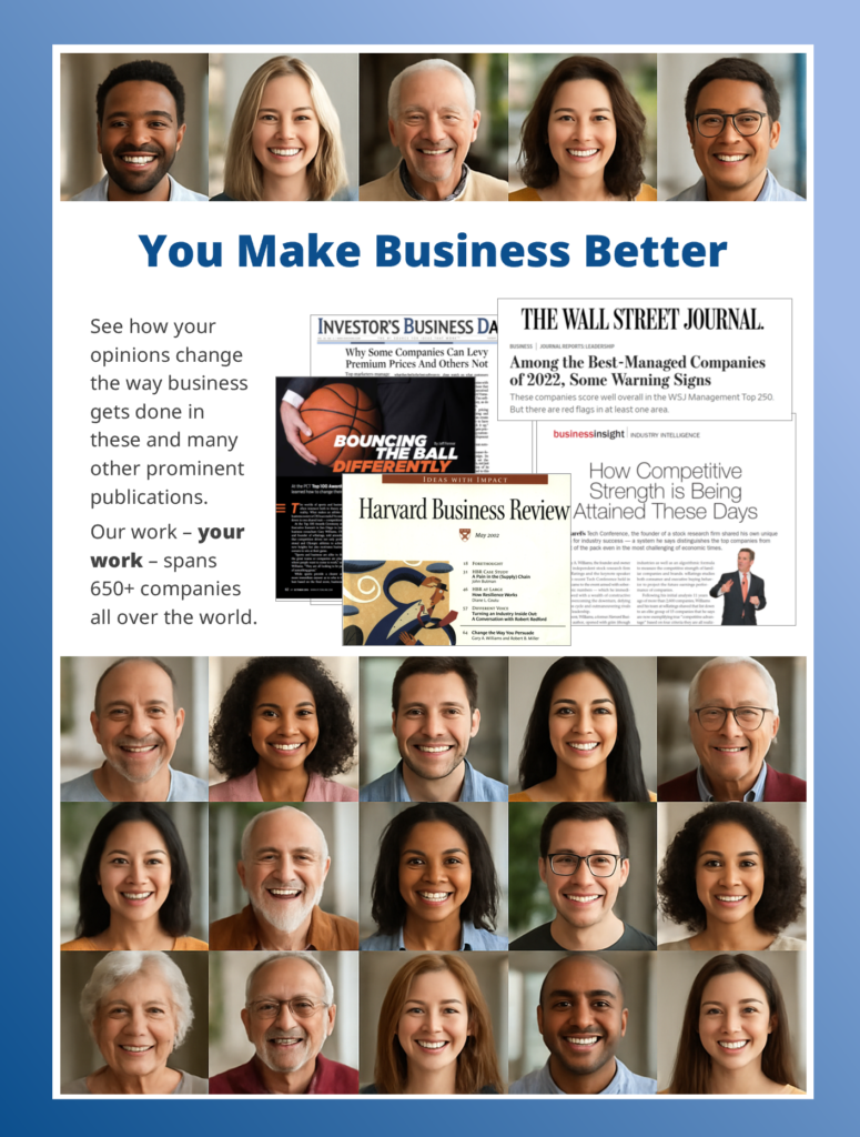 Each quarter—typically in March, June, September, and December—we’ll reach out to get your input. It starts with short interview (<1 minute) to find out which companies you have and have not done business with in the last 12 months. You will be randomly assigned multiple companies to give your opinion on each one and one of their key competitors.