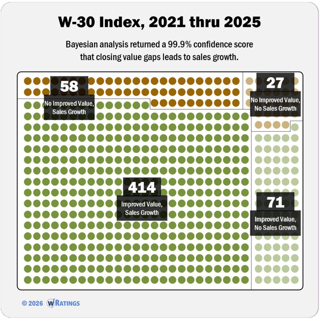 With near certainty (99.8%), customer and financial data from the W-30 Index proves that closing customer value gaps drives sales growth.